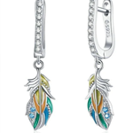 Hoop earrings with crystals and colorfully enamelled bird feather |… | Spoo-Design Crystal-studded folding hoop earrings with yellow-blue enameled bird feathers. The hoop earrings are set with clear crystals, the feathers are partially yellow, blue and green enamelled and with two small blue zirconia.