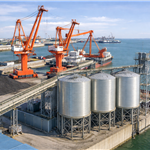 A steel silo offers bulk material storage from 100–20,000 m³ capacity, with φ3–35 m diameters, and includes conveying, dust-control, discharge, and liquid interface features.